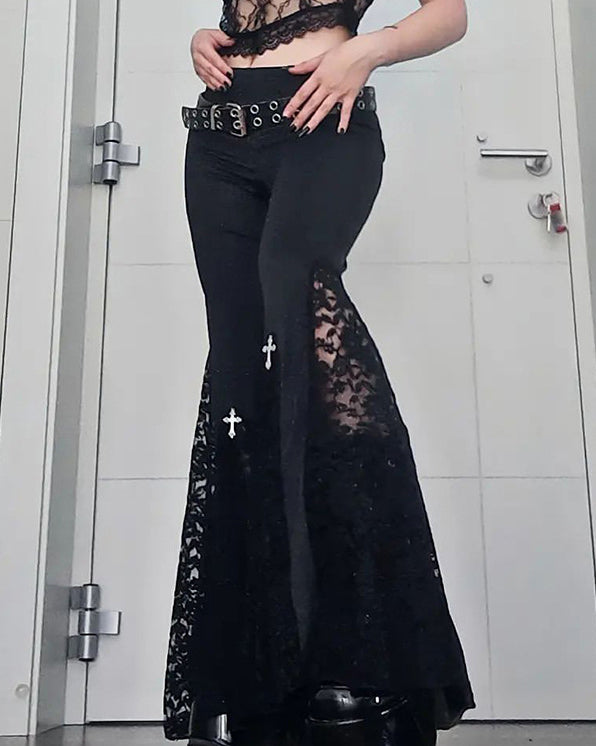 Dark Punk Style High Waisted Lace Hollow Black Micro Flared Pants
