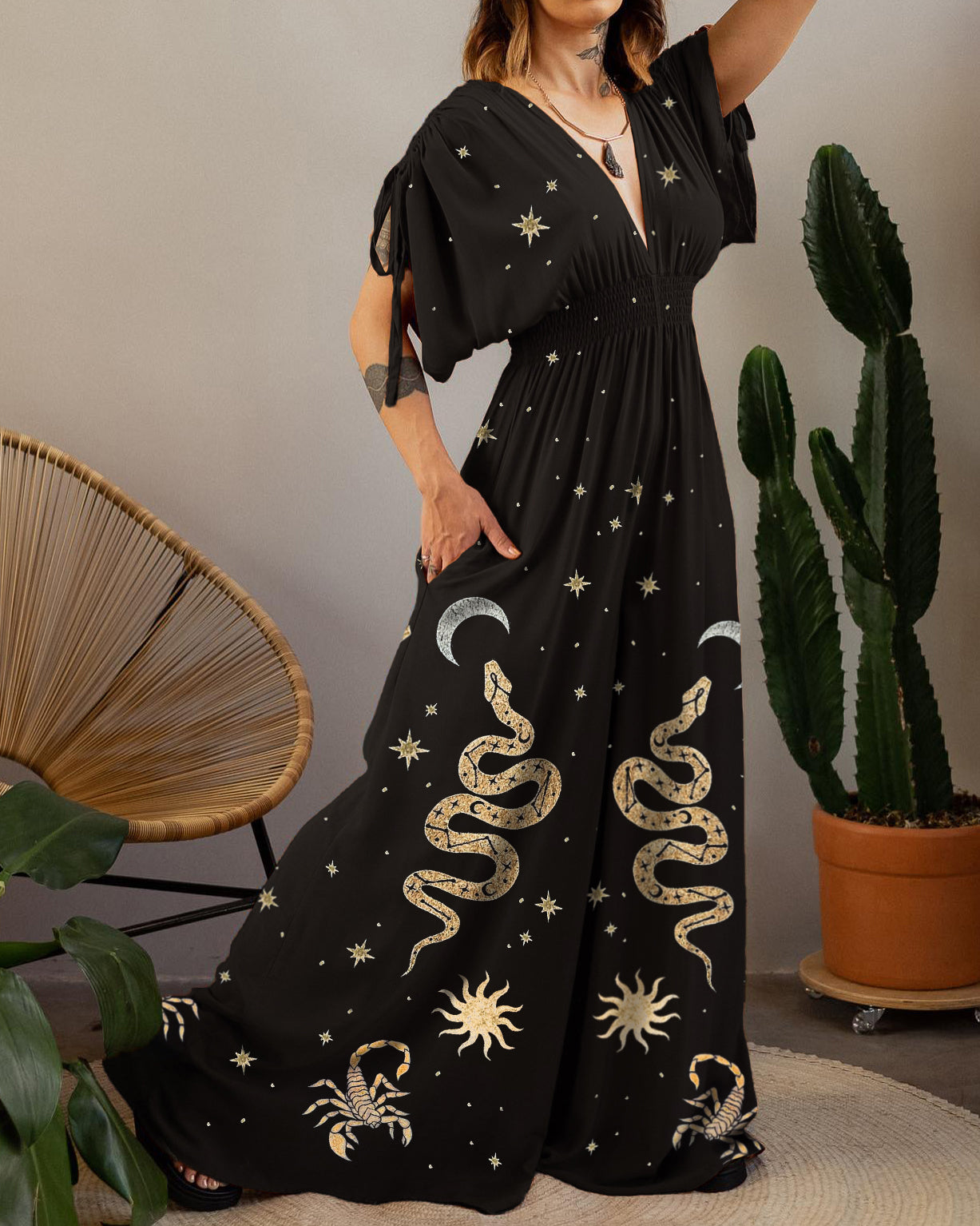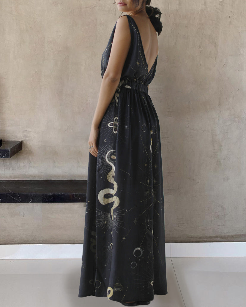 Golden Snakes Scorpio Constellation Witchery Starry Printed Maxi Dress