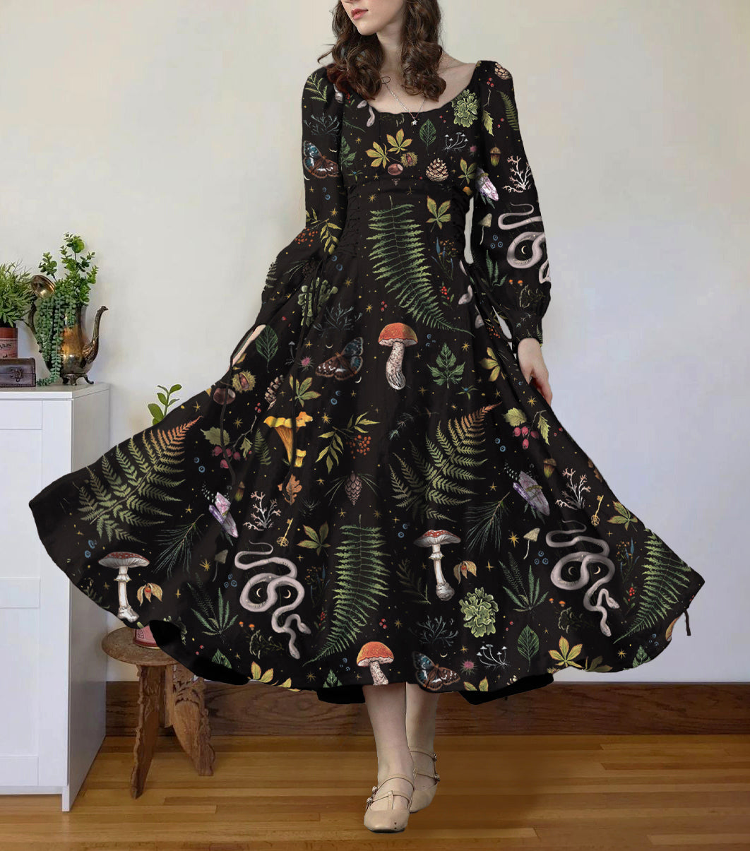 Witchcraft Crow Aesthetic Faun Printed Button Up Midi Dress