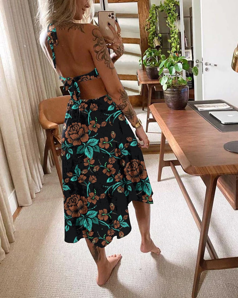 Casual Tropical Magic Garden Print Waist Sun Dress