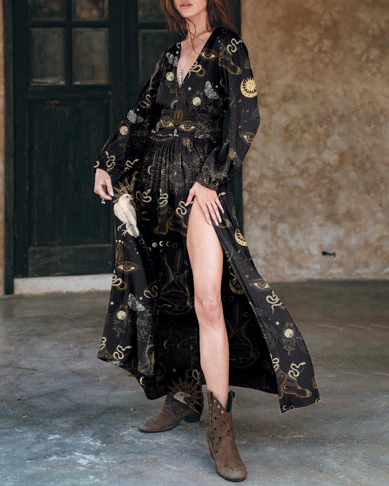 Eyes Of The Mystery & Divine Birds Printed V-neck Maxi Dress