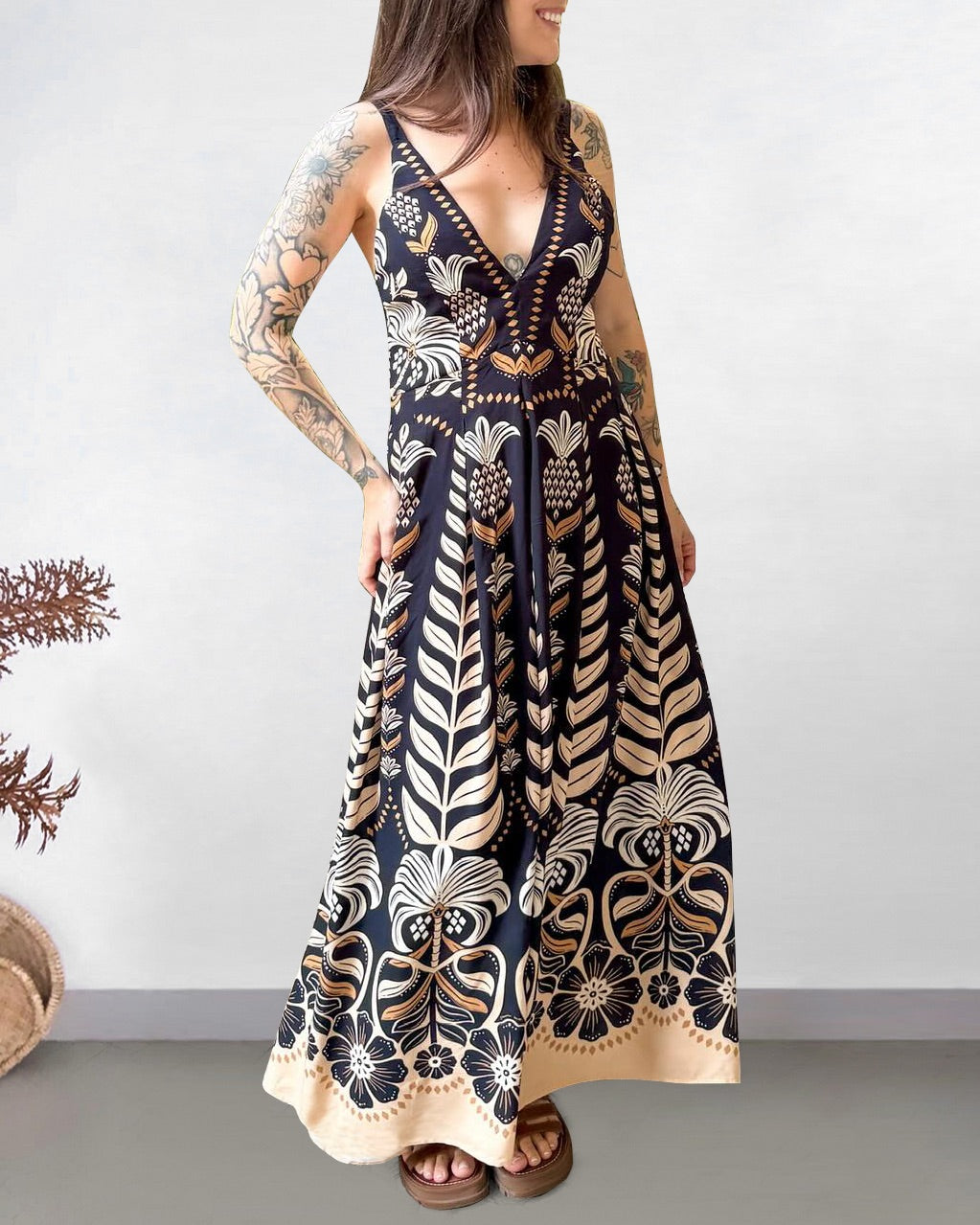 Large Floral And Pineapple Fairy Pattern Print Long V-neck Dress