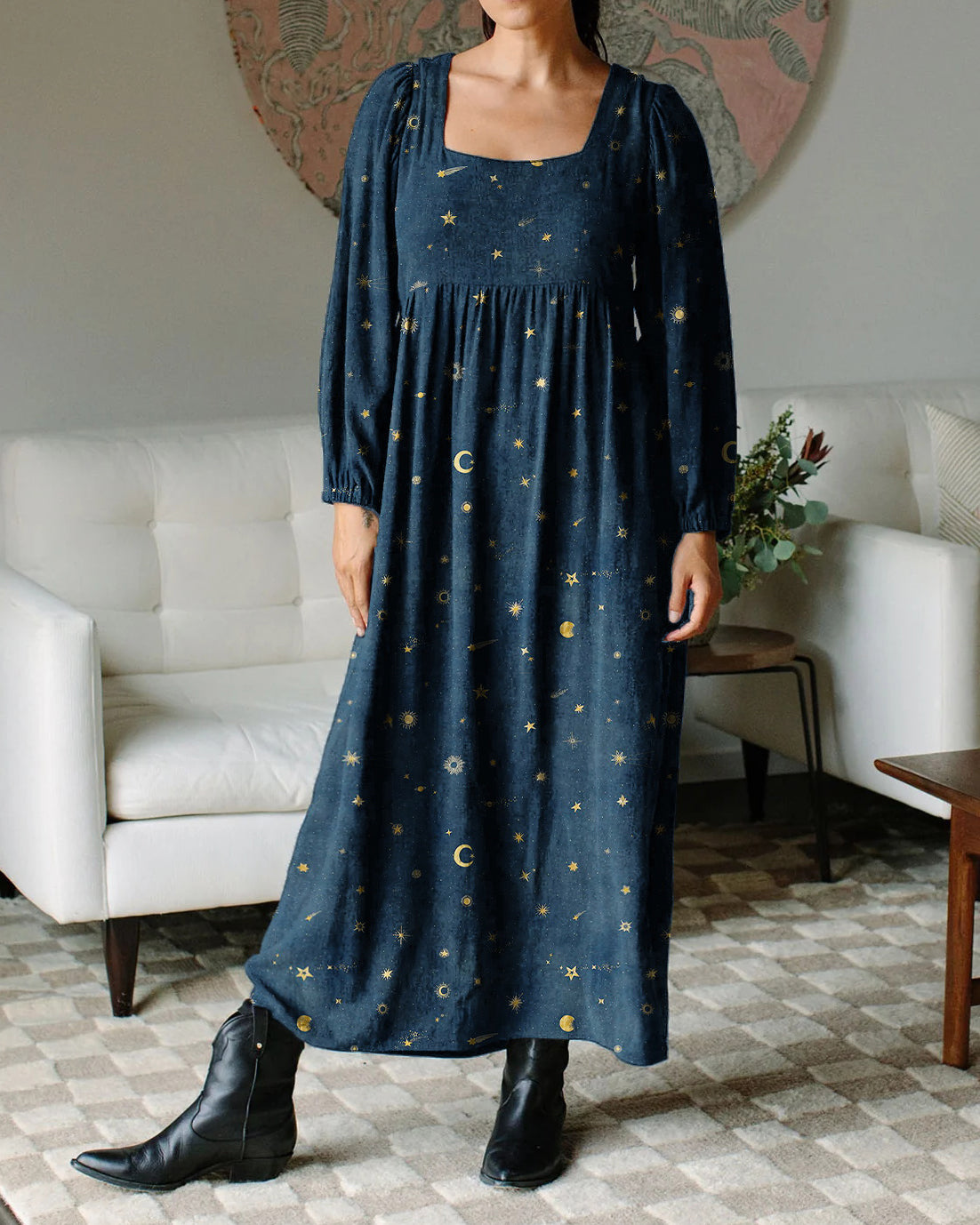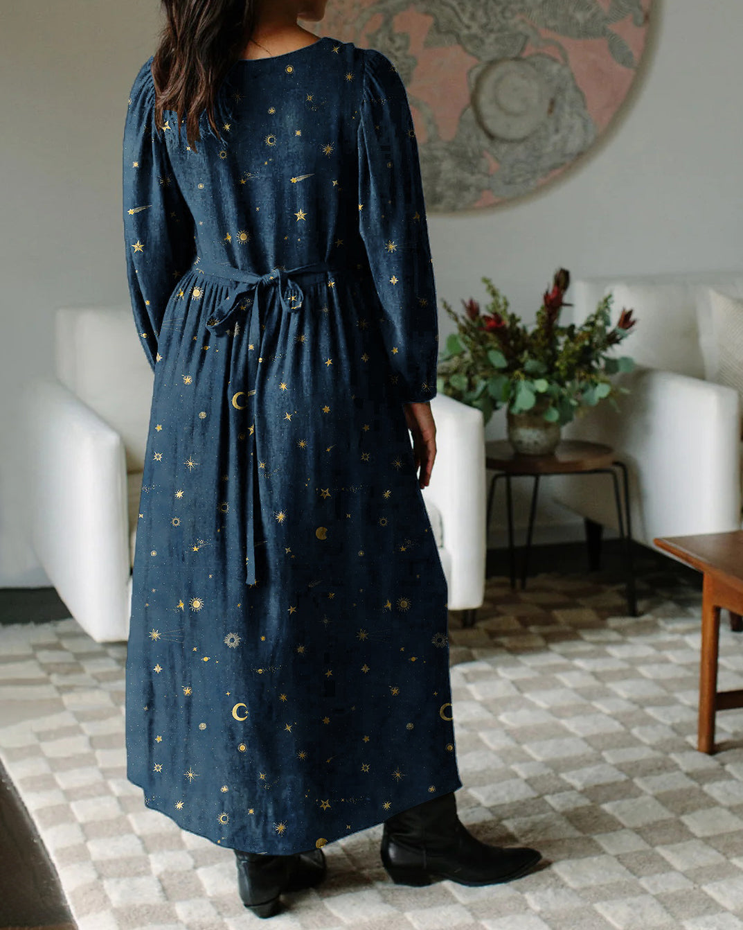 Ancient Moon Goddess Star Pattern Print Chiffon Long Sleeve Dress