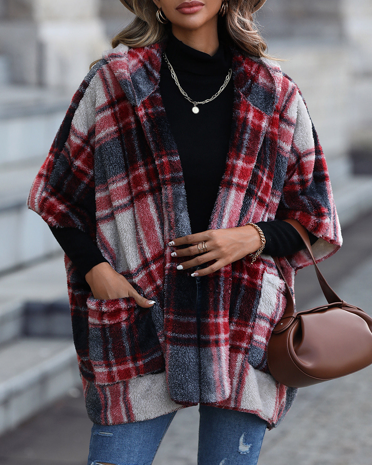 Scottish Casual Plush Hooded Quarter Sleeve Loose Plaid Buttonless Jacket