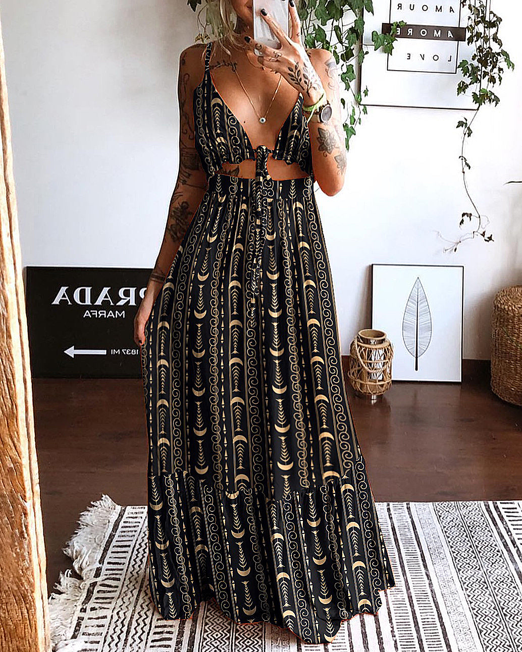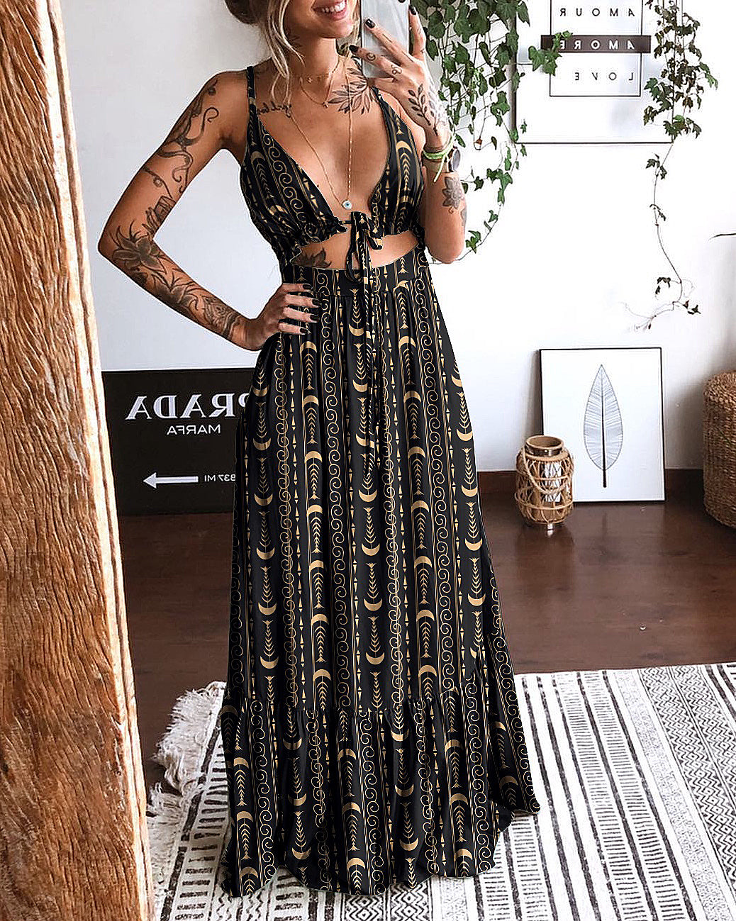 Gold Moon and Stars Printed Hollow Backless Dress