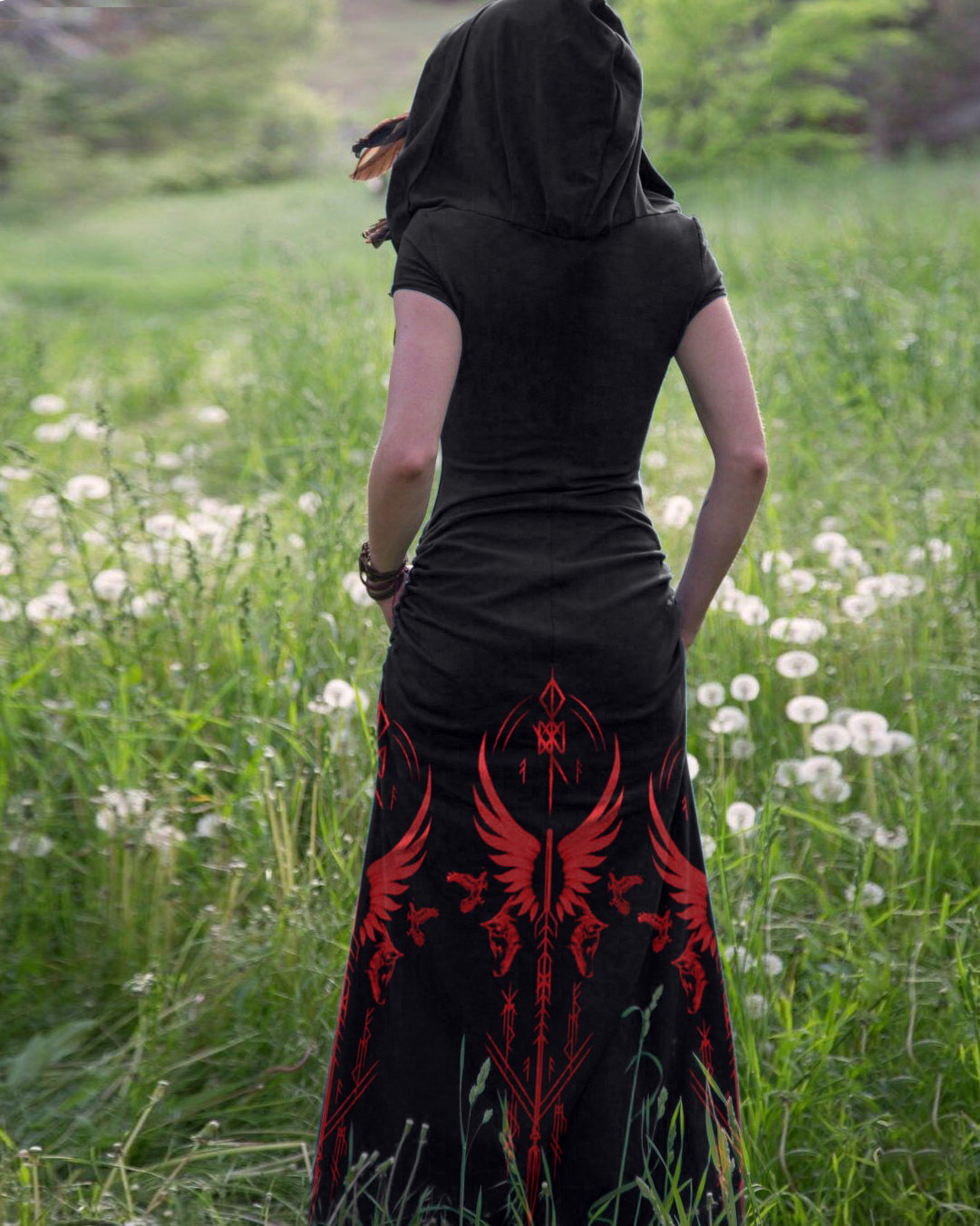 Vintage Tribal Eagle Viking Ethnic Pattern Hooded Slit Maxi Dress