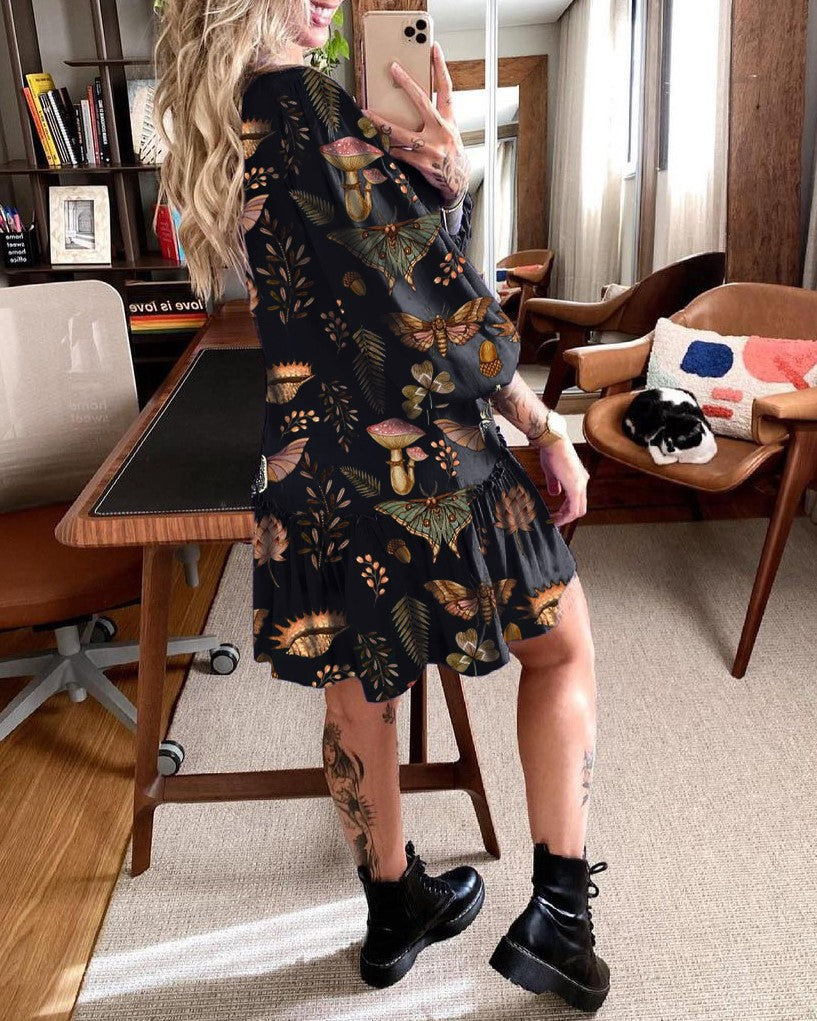Moths In Fungis Paradise Printed V-neck Mini Dress