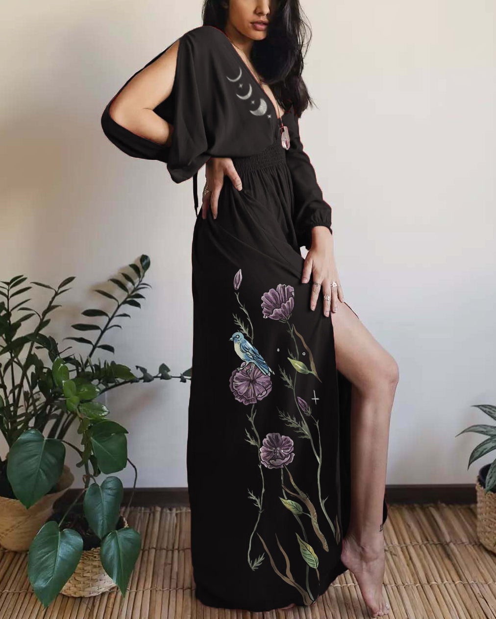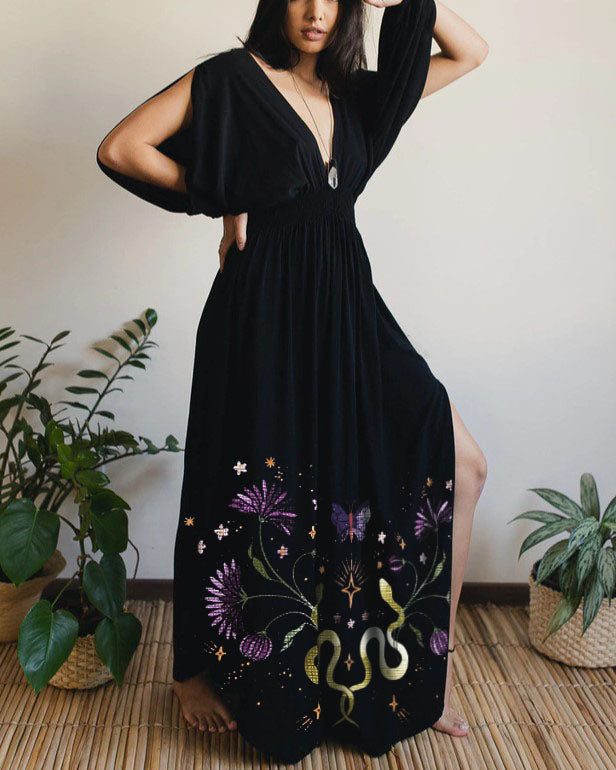 Silver Snake Luna Bats Plants Printed V-neck Maxi Dress