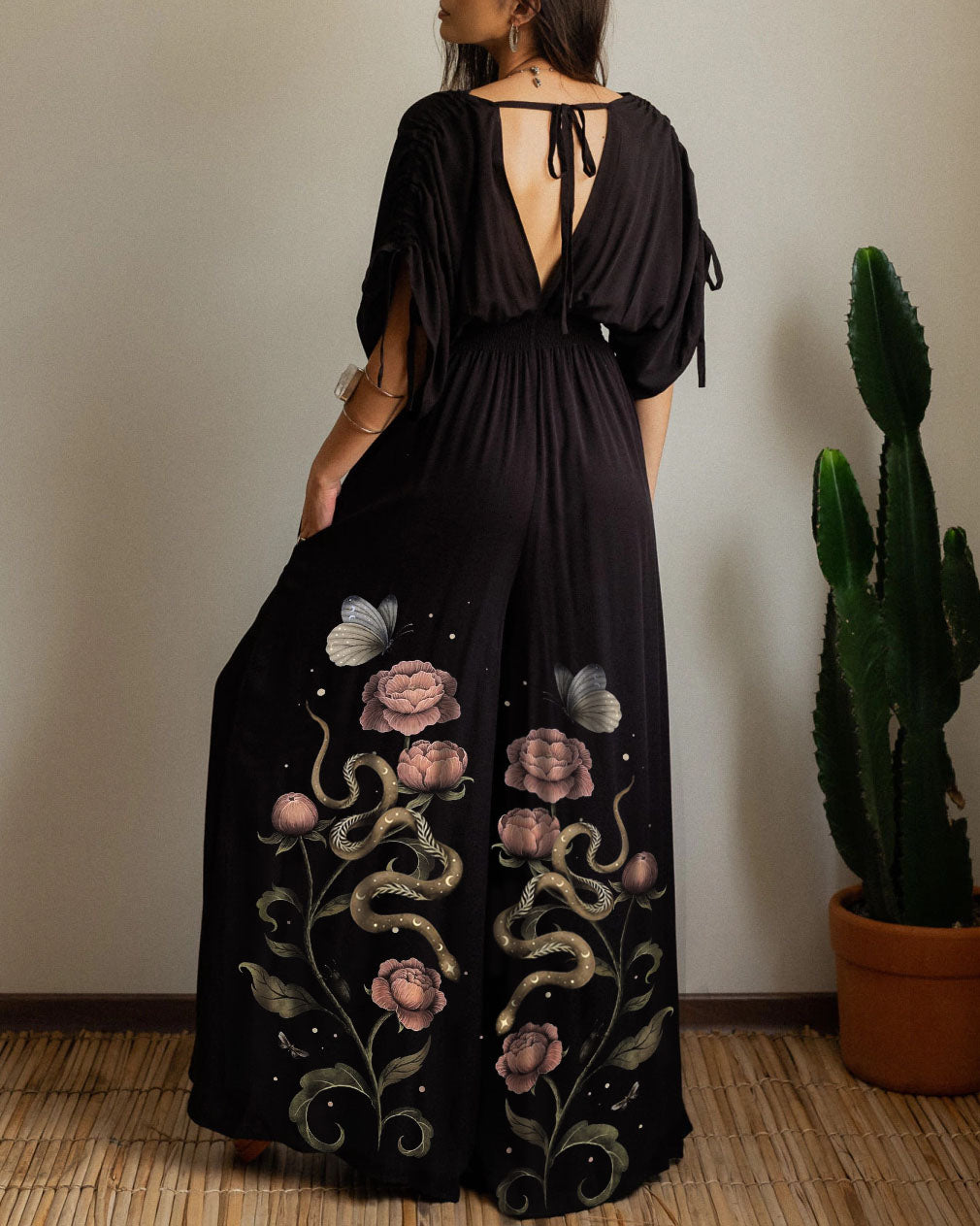 Dreamy Floral Fairyland Swallows Printed V-Neck Jumpsuit