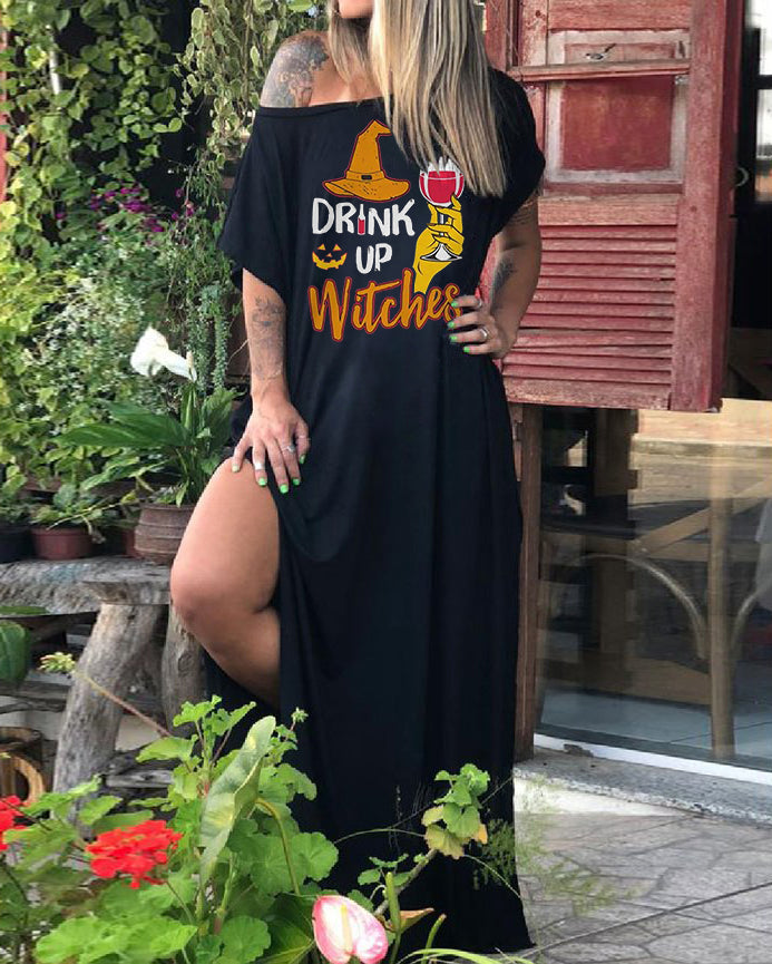 " DRINK UP Witches" Print Casual Slit Dress