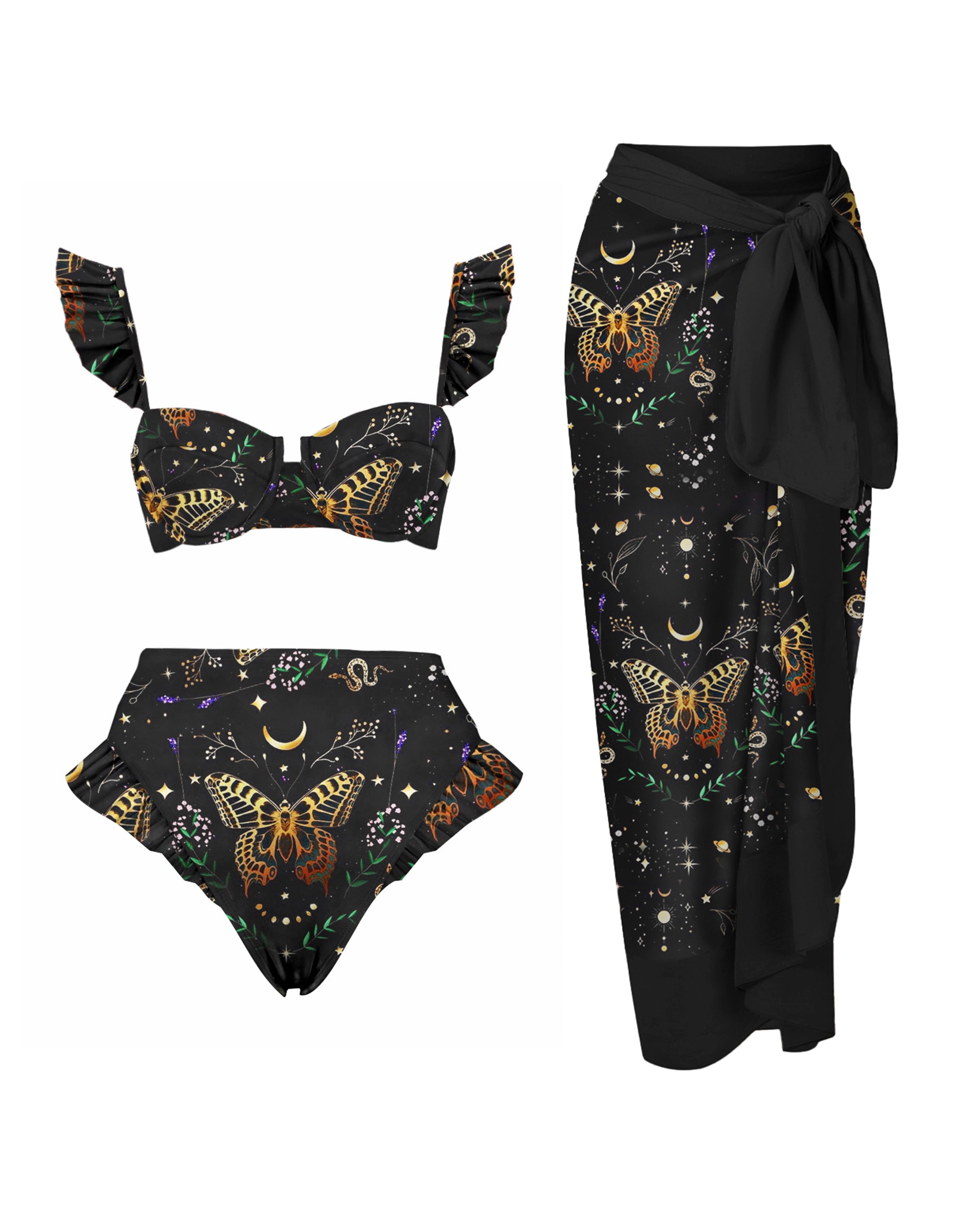 Fancy World Butterfly Print Ruffle Sleeve Bikini Set
