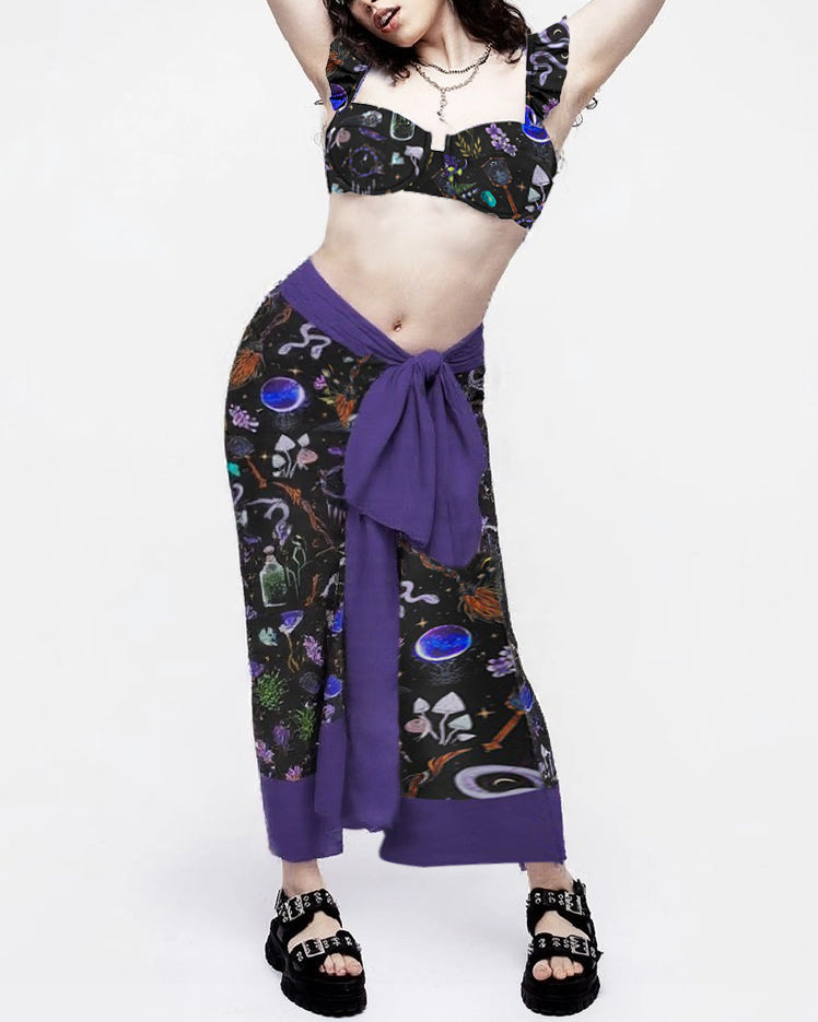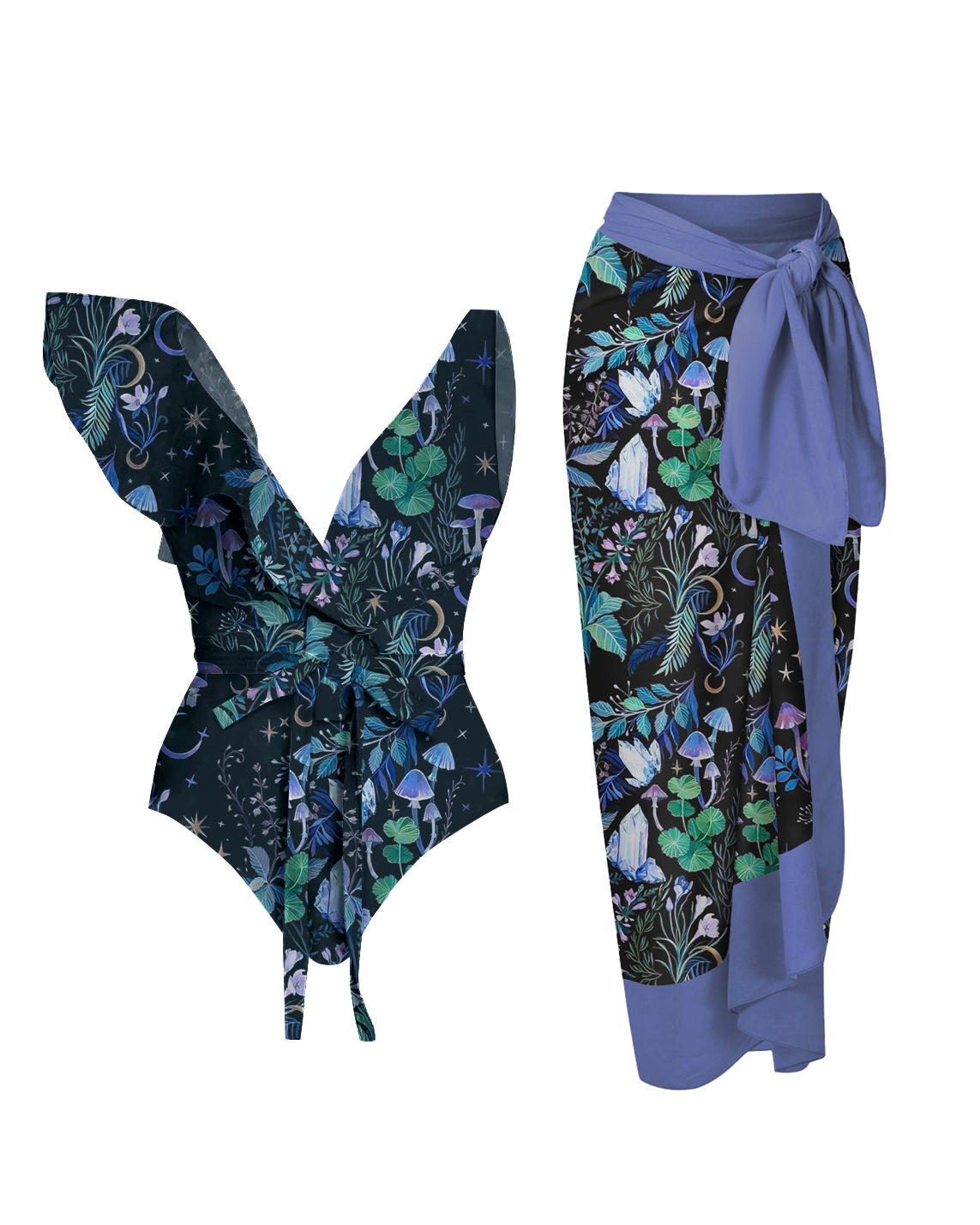 Purple Mushrooms Wonderland Printed Ruffle Swimsuit & Sarong