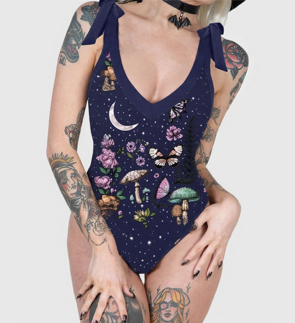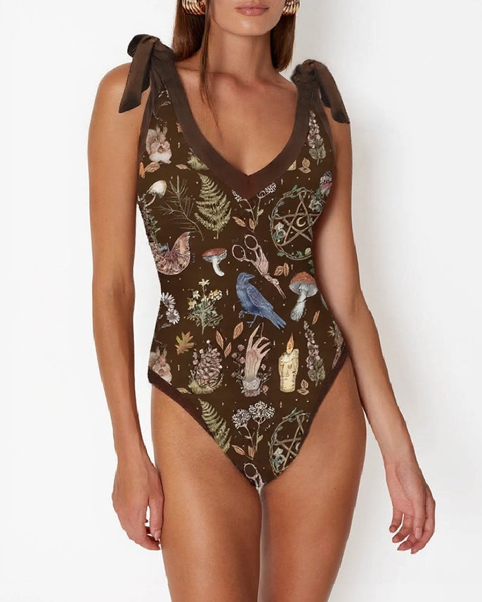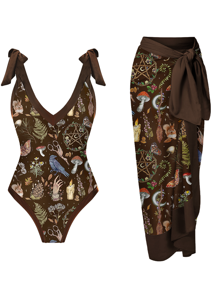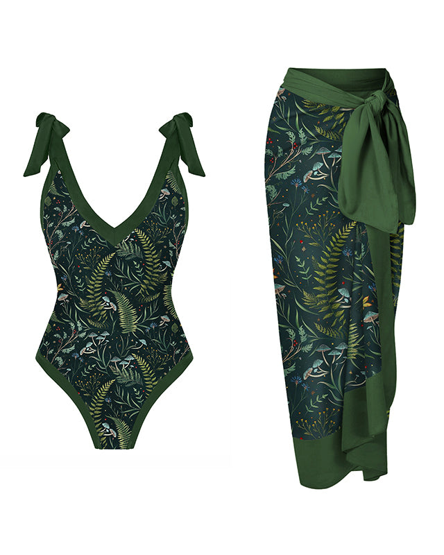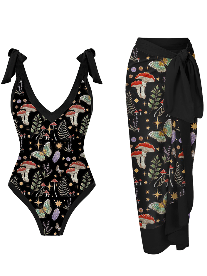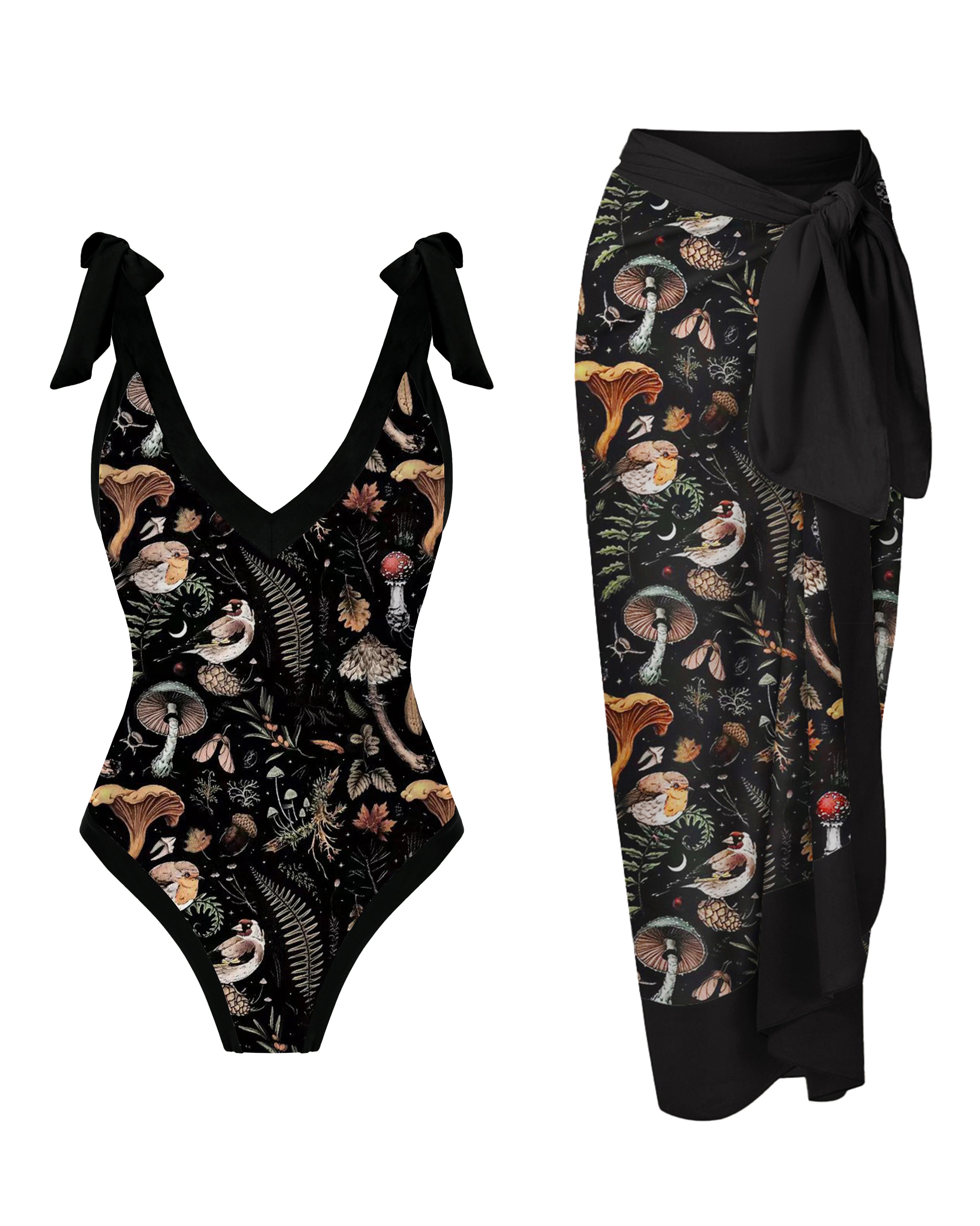 Mushrooms Forest Printed V-Neck One Piece and Sarong