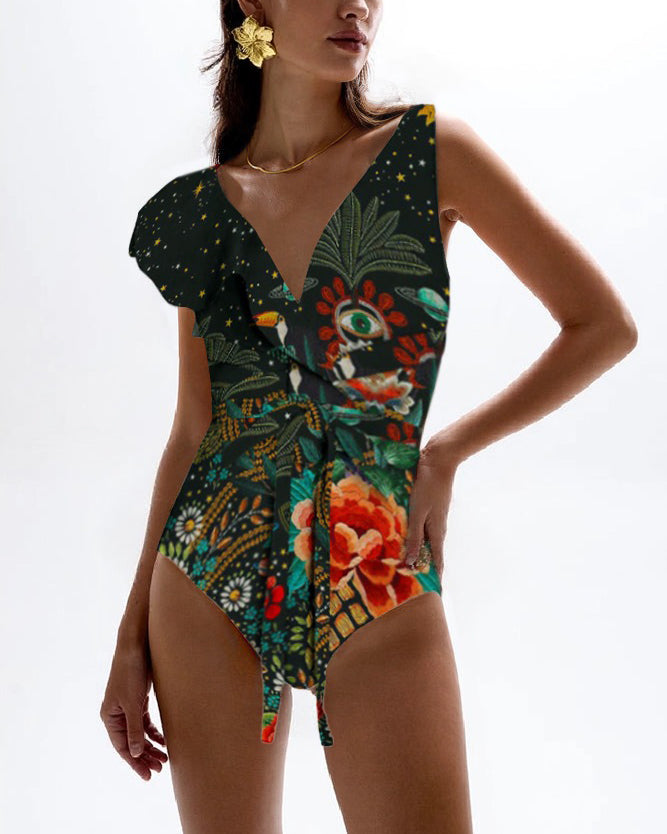 Mystic Snake Dreamland Printed Ruffle V-Neck Belt Backless One Piece