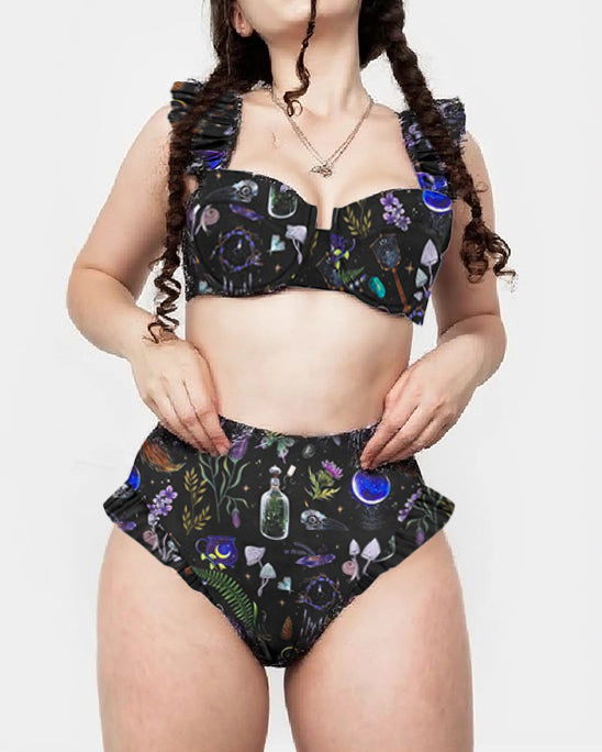 Mysterious Mushroom Paradise Print Ruffle Sleeves Bikini