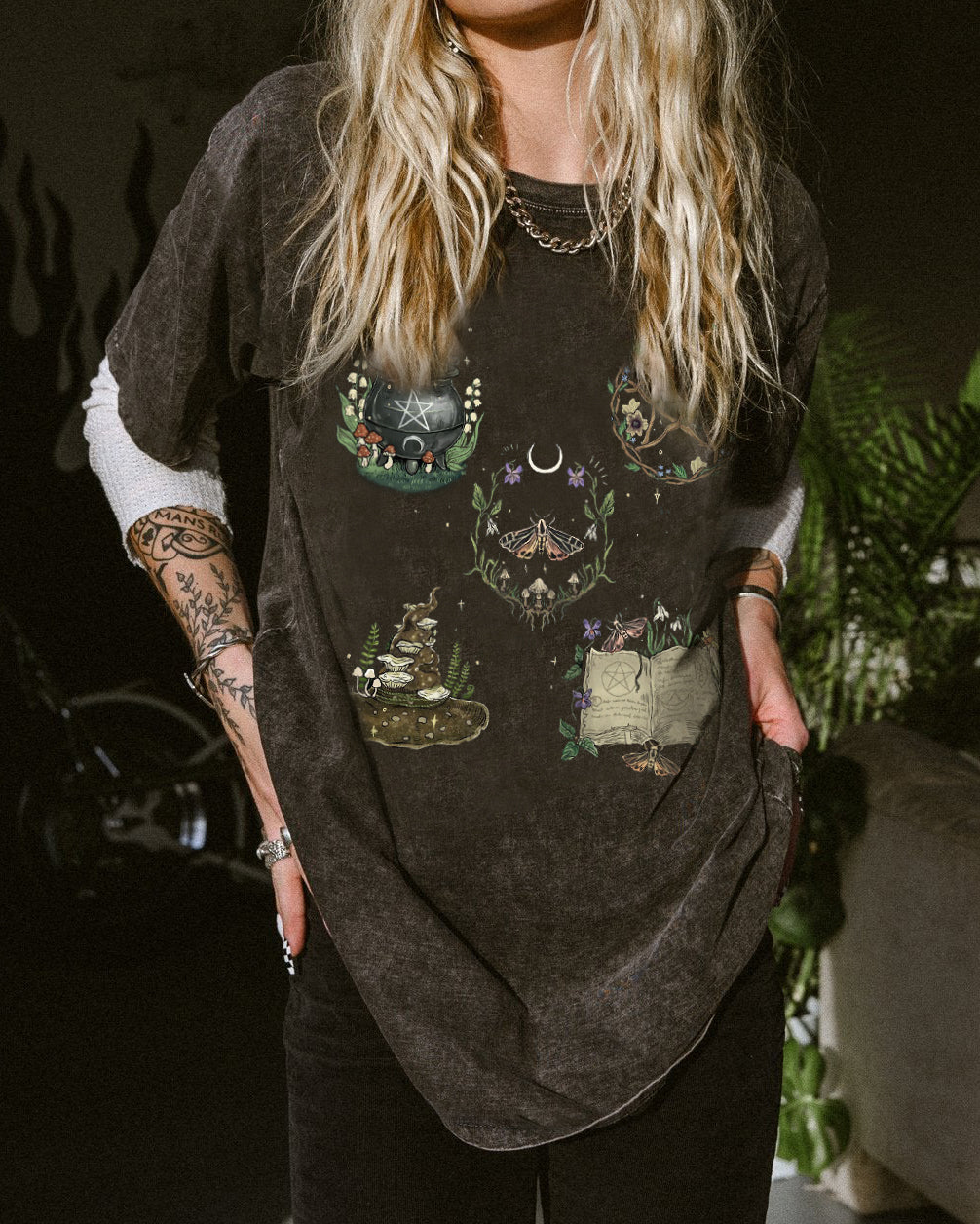 Dark Grey Witchy Elements Printed Casual Oversized T-Shirt