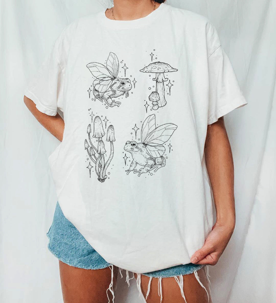 White Fairytale Frogs Mushroom Printed Casual Oversized T-Shirt