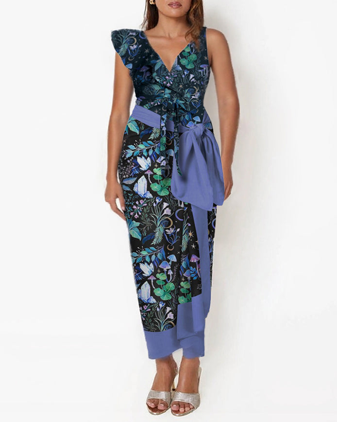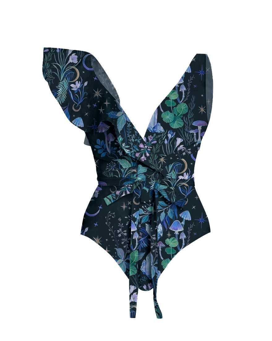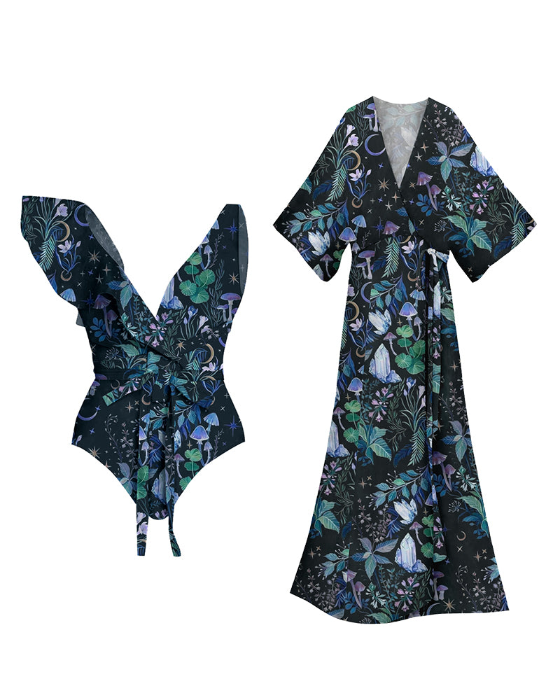 Purple Mushrooms Wonderland Printed Ruffle Swimsuit & Sarong