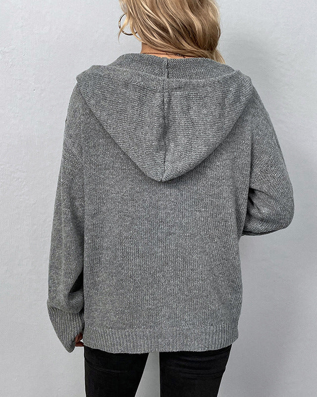 Solid Color Hooded Single-Breasted Drawstring Knitted Cardigan Sweater